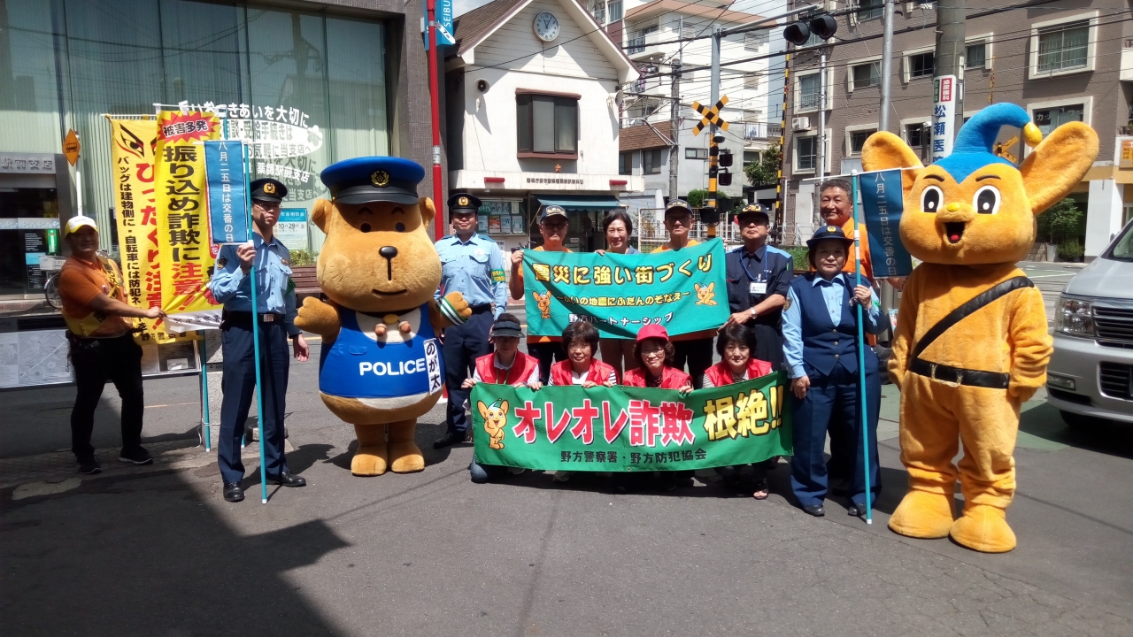 さてそんな8月25日(木)の11:00から、新井薬師前駅で野方防犯協会と野方警察に協力して「振込め詐欺防止キャンペーン」を行いました。、松が丘片山町会からも3名が参加して、道行く人にチラシとティッシュを手渡しながら声掛けをしました。