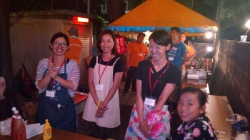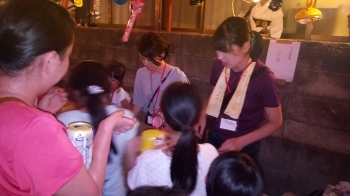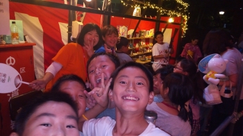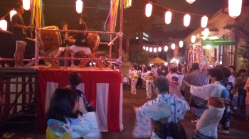 櫓の上で輝鼓会の皆さんの叩く太鼓に合わせて「東京音頭」や「アンパンマン音頭」など大人も子供も楽しめる曲に乗り皆が楽しんでいました。今年は2020年のオリンピックを盛り上げようと「東京五輪音頭」も新たに加えました。昨年に引き続き中野区国際交流協会から7名の方が参加されました。今年は二日間の参加者が約1,300人と、これまでで最高の人出となりました。