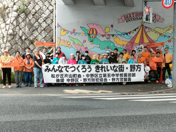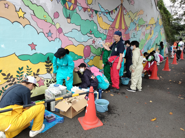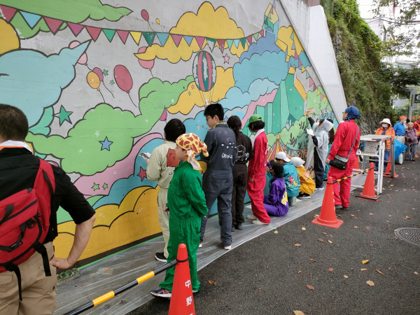 この行事には、中野区、野方警察署、野方防犯協会が協力してくれています。この壁面は東京都の管理物件で、都との交渉や警察への道路使用許可申請書の提出、さらには高いところの作業用に脚立のレンタルなど、手続きは全て中野区の防災危機管理課生活・交通安全係の大滝さんに手配していただきました。そして機材レンタル料は野方防犯協会に協賛していただき、野方警察からは交通整理やふれあいポリスの出動などで応援していただきました。